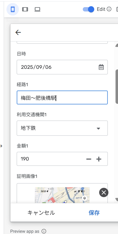 先ほどのタスクアプリと違って項目が多く交通機関の紐づけや経費画像の保存もできるようにカスタマイズ